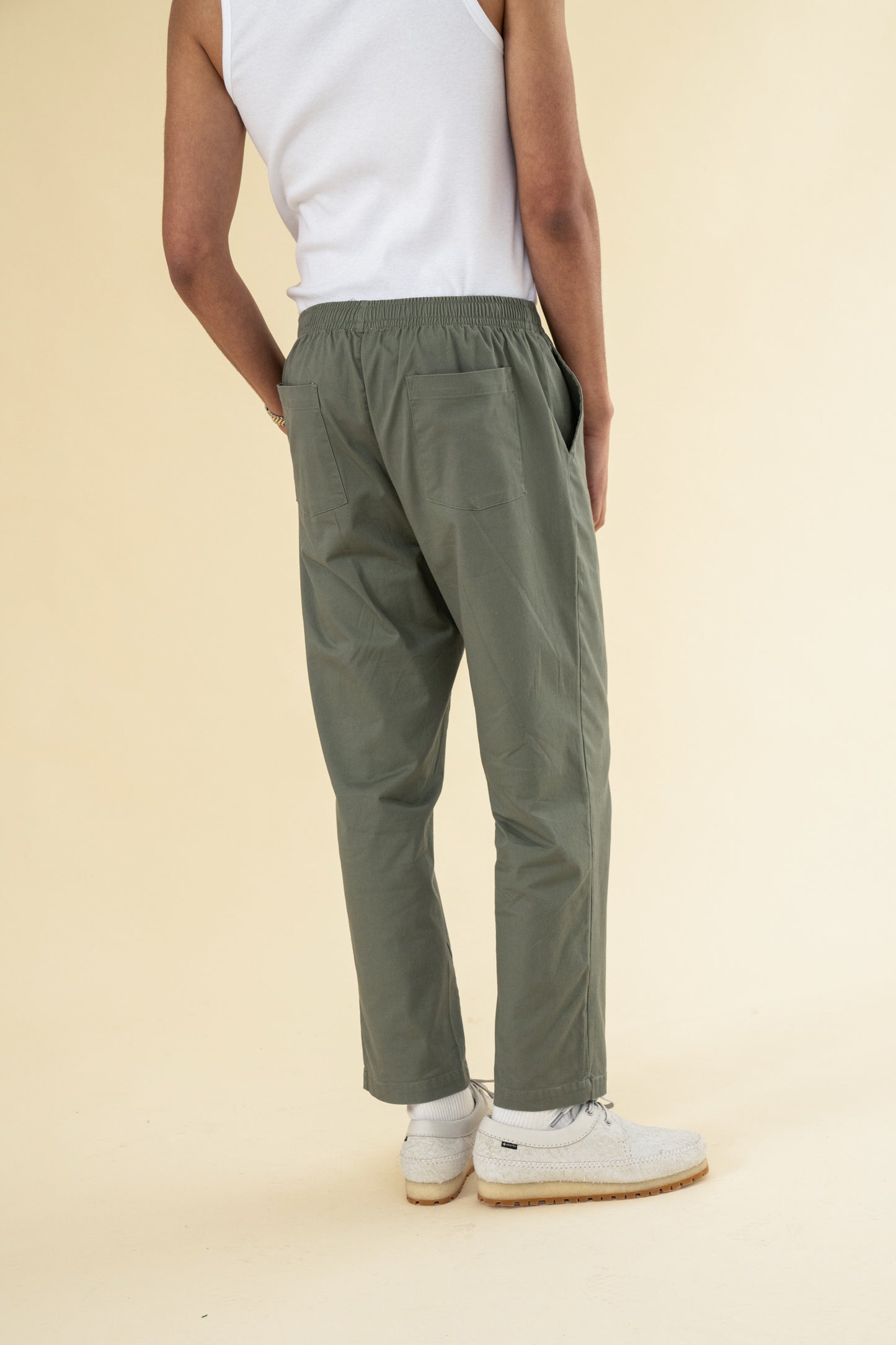 Your everyday trousers. Elasticated waist, wider legged and not any shape these won't fit. A great midweight canvas fabric, versatile to go with any fit or style. Nice and easy does it.